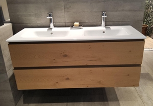 -S227087 Doppelwaschtisch Roma 120 Keramik mit 2 Armaturenbohrungen und Überlauf Produktfarbe: weiss glanz Breite: 121cm Tiefe: 51cm -S000127 Badezimmermöbel CHANGE THIN 120 Doppel Front & Korpus: Rovere RA4 Griff: Clip Grifffarbe: schwarz matt wandhängend, bestehend aus: 2 Schubladen übereinander mit Sifonausschnitt oben Vollauszug und Blumotion Breite: 120cm Höhe: 50cm Tiefe: 50cm