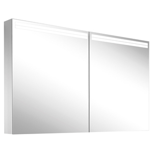 silbereloxiert Aluminiumprofil, UP/AP Montage 2 Doppelspiegeltüren LED-Beleuchtung, 1 x 30 Watt, 1 x 19 Watt Tunable White, dimmbar, 2000-6500 Kelvin 8336 Lumen, 2 Doppelsteckdosen 1 x rechts oben, wechselbar nach links und 1 x unten an Zwischenwand rechts Folientastatur innen links an Seitenprofil 4 Glasablagen, IP44 Energieklasse C